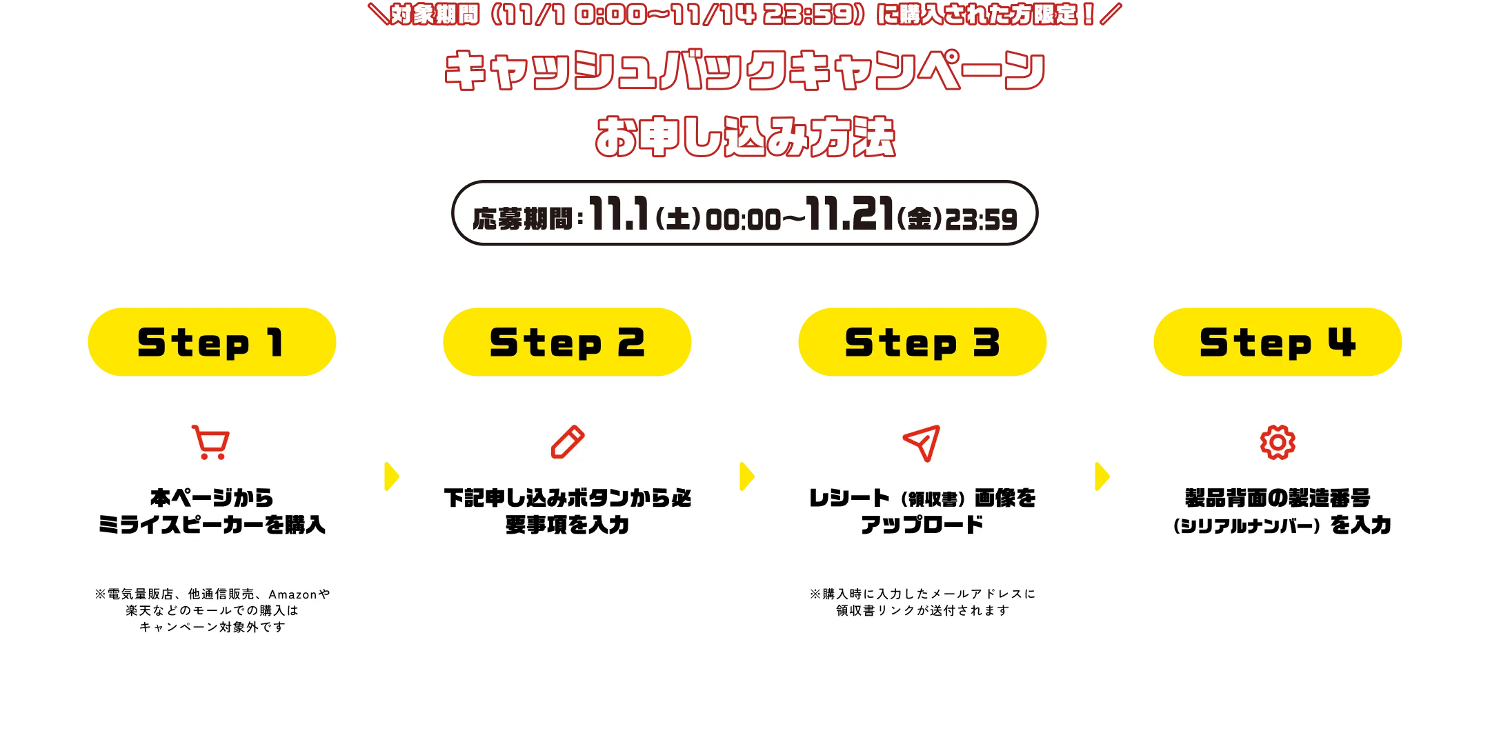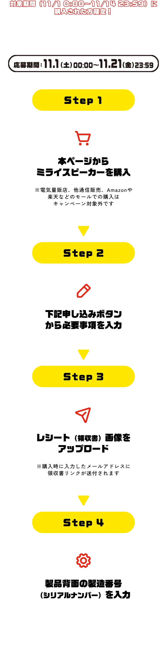 ②対象期間中に購入し、購入後のメール記載の注文番号(もしくは領収書)を取得し、且つ製品到着後の製品に記載の製造番号も入力いただいた方