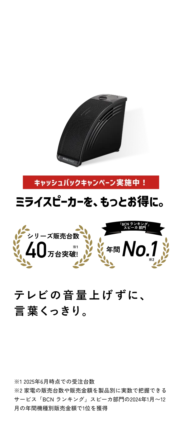 ミライスピーカーから出る「言葉」の音は、BGMや効果音に埋もれずにくっきり聞こえるので、ニュースもドラマのセリフも快適に聞こえます。ミライスピーカーから出る「言葉」の音は、BGMや効果音に埋もれずにくっきり聞こえるので、ニュースもドラマのセリフも快適に聞こえます。